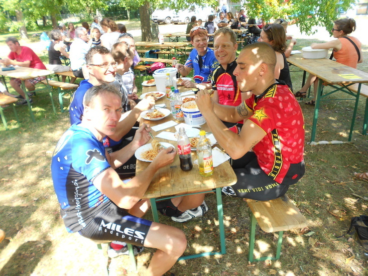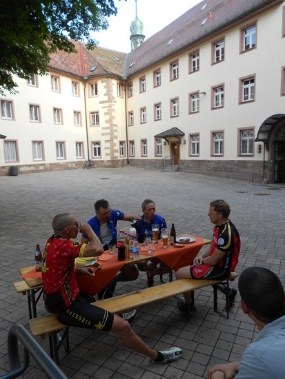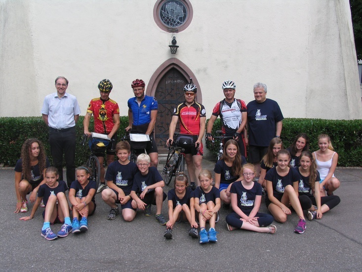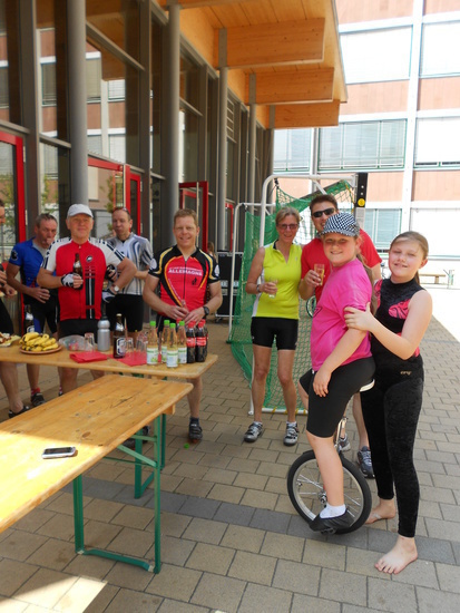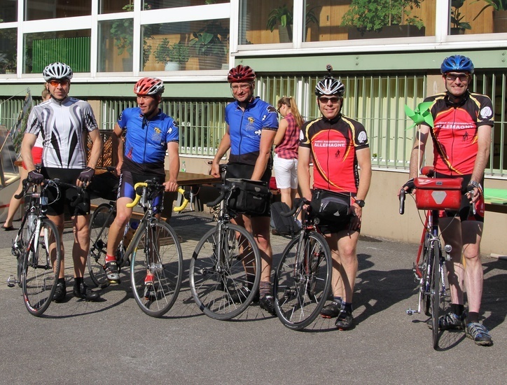 | Fr, 16.35 Uhr: | 455 km | Die Gruppe fährt gestärkt in Karlsruhe nach einer Nudelpause weiter. Auf dem Schulfest im Caritas-Waldheim wurden die Fahrer hervorragend verpflegt. |